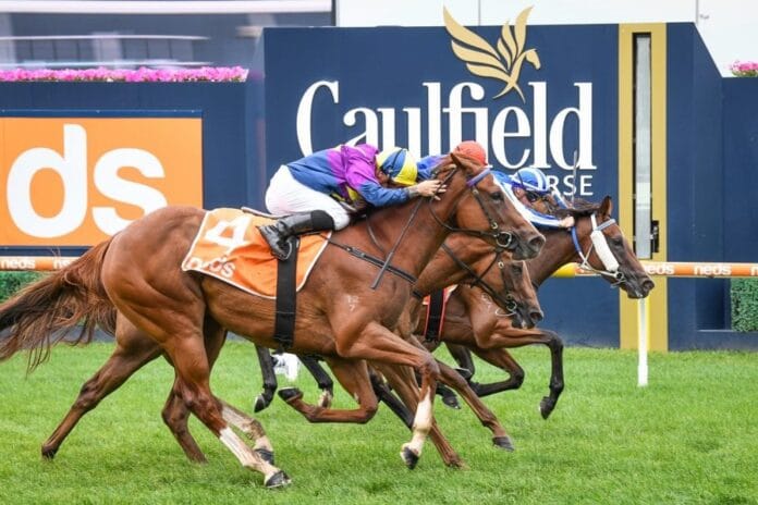 The gelding hung on to defeat Rajpipla ($5) by a head with Pufnstuf ($4.60) third.