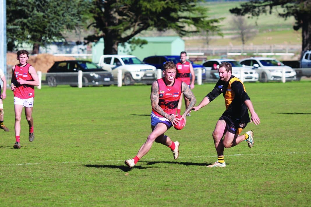 Romsey’s Nathan Rayment played his best game of the season and Corey Pertzel and Matt Burkett played customarily strong games, while reliable defender Michael Tinkler swung forward to kick three goals and Dean Walsh booted four.