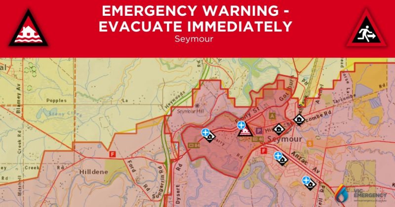 “This Emergency Warning is being issued for Seymour. If you live, work or are holidaying in this area, you should evacuate immediately.
