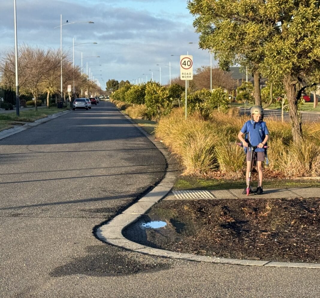 The incident occurred late last month, when local mother Kellie Murphy’s son Jaxton approached the roundabout at Wallara Waters Boulevard and Blue Lake Drive to cross on his bike. Though vehicles have right of way at the intersection, an approaching car stopped to let the child cross safely. However, as he crossed, another car overtook the stopped car, hitting the front of Jaxton’s bike and sending him onto the bitumen.