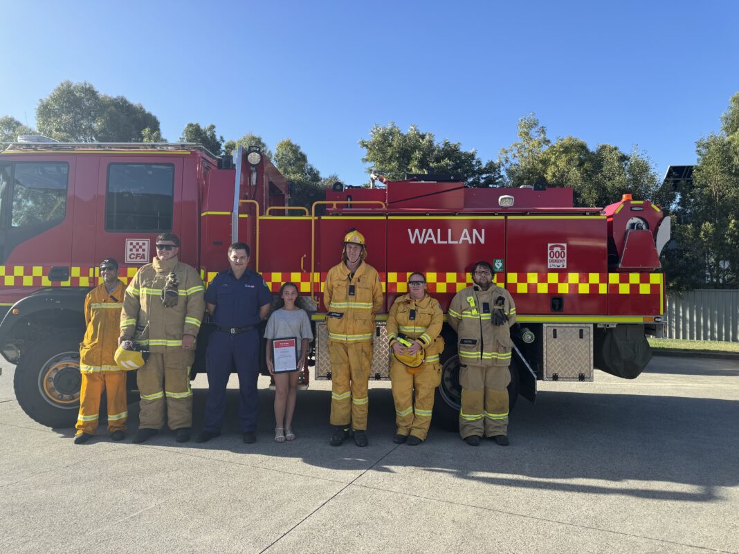Donning their firefighting gear in honour of the special occasion, brigade members gathered to observe Wallan Fire Brigade Captain Tim Benetti present Kyah with the award last Wednesday, who was full of praise for the young girl.